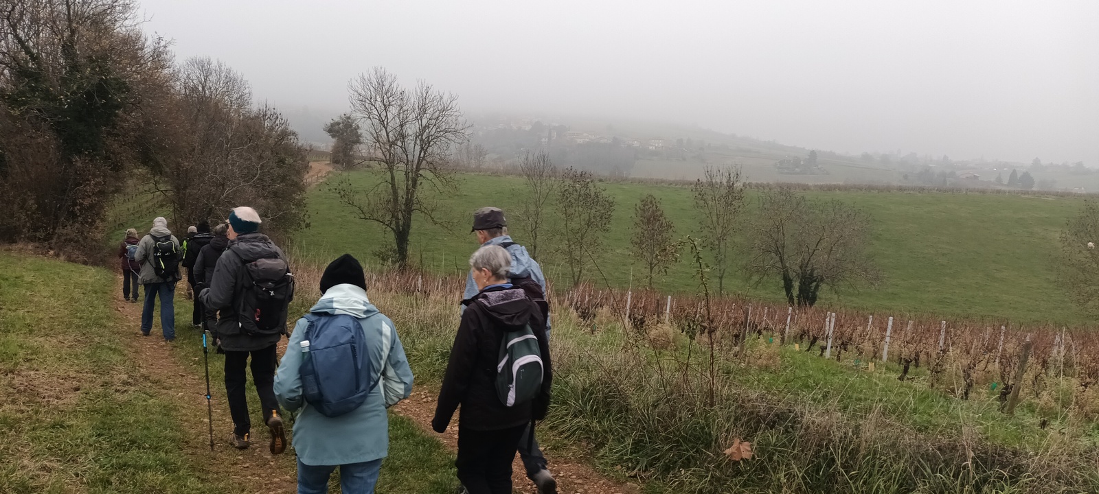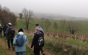Marie-Odette BERTHET le 29 novembre 2025 à 10:42 Merci aux 28 participants qui, malgré le brouillard, ont bien voulu arpenter le vignoble du beaujolais sur les communes de Liergues, Lacenas et Jarnioux en empruntant un petit bout de la voie du Tacot et le Bois de la Gorge.