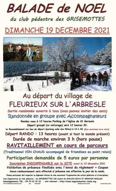 DEROULEMENT : l'après midi démarre par une petite randonnée sur le village de FLEURIEUX avec un point relais avec le traditionnel vin chaud. agrémenté par quelques friandises.