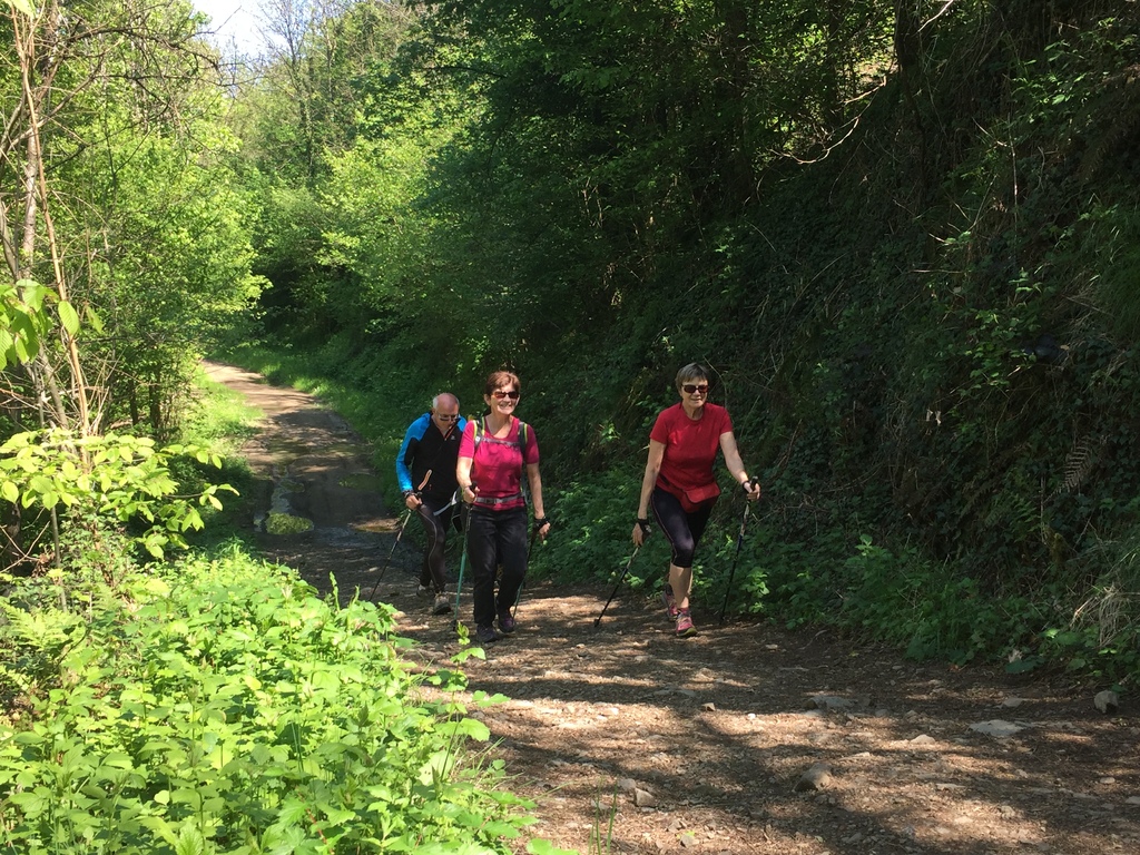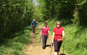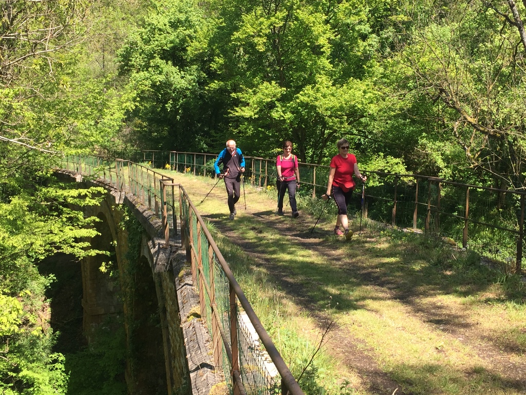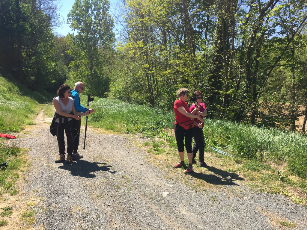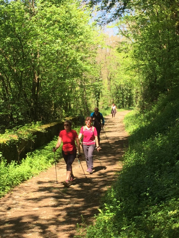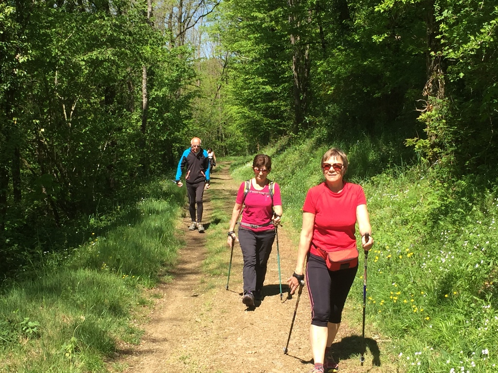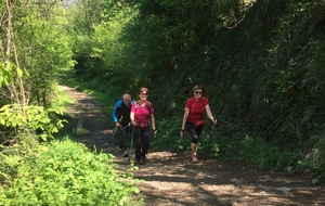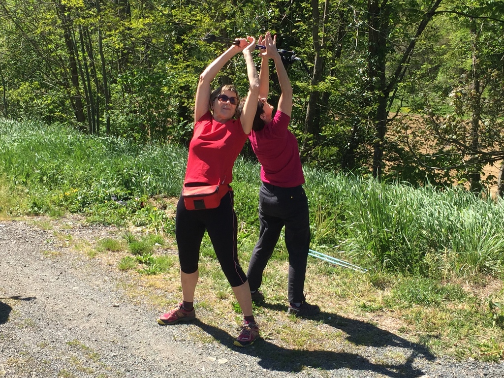 Marche nordique entre les Ponts Tarrets et Sarcey, quelques exercices à deux d'échauffement musculaire (passage de bâtons) et marche sur l'ancienne voie du Tacot.